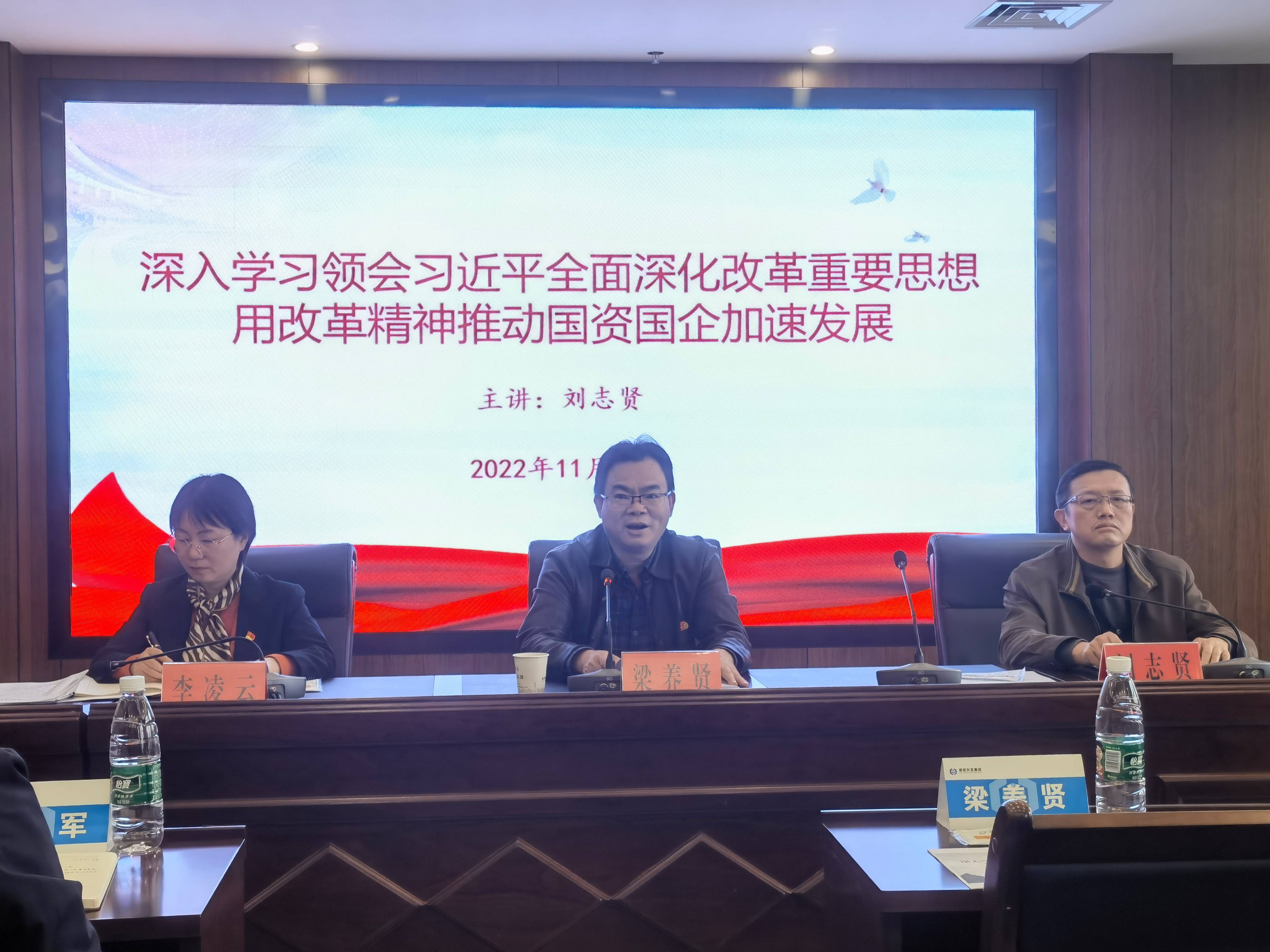 劉志賢以《深入學(xué)習(xí)領(lǐng)會習(xí)近平全面深化改革重要思想 用改革精神推動國資國企加速發(fā)展》為題進(jìn)行了授課,圍繞“改革開放的光輝歷程和重大成就、習(xí)近平全面深化改革主要思想、國有企業(yè)改革發(fā)展現(xiàn)狀、進(jìn)一步推動國有企業(yè)改革發(fā)展”等四個方面進(jìn)行闡釋,他強(qiáng)調(diào)推動國有企業(yè)改革發(fā)展,構(gòu)建高質(zhì)量發(fā)展格局,必須進(jìn)一步深入學(xué)習(xí)領(lǐng)會習(xí)近平總書記關(guān)于全面深化改革、特別是國資國企改革發(fā)展系列重要論述,要繼續(xù)貫徹落實全國國有企業(yè)改革座談會精神,高質(zhì)量完成國有企業(yè)改革三年行動任務(wù)。