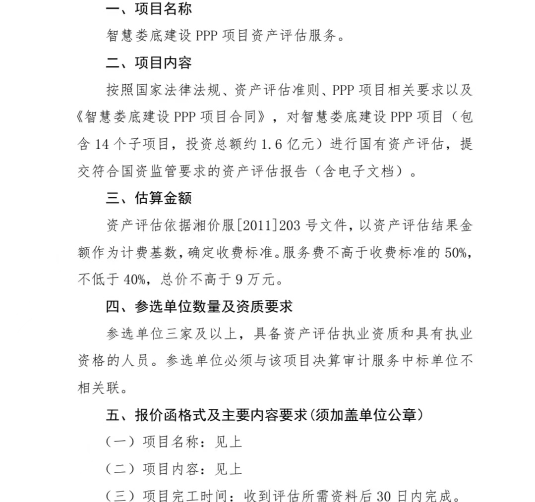 關(guān)于智慧婁底建設(shè)PPP項目資產(chǎn)評估服務(wù)的詢價比選公開信息