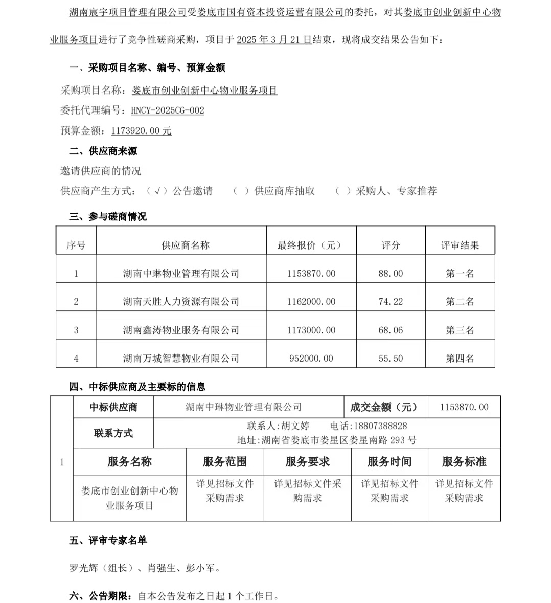 婁底市創(chuàng)業(yè)創(chuàng)新中心物業(yè)服務(wù)項(xiàng)目成交結(jié)果公告